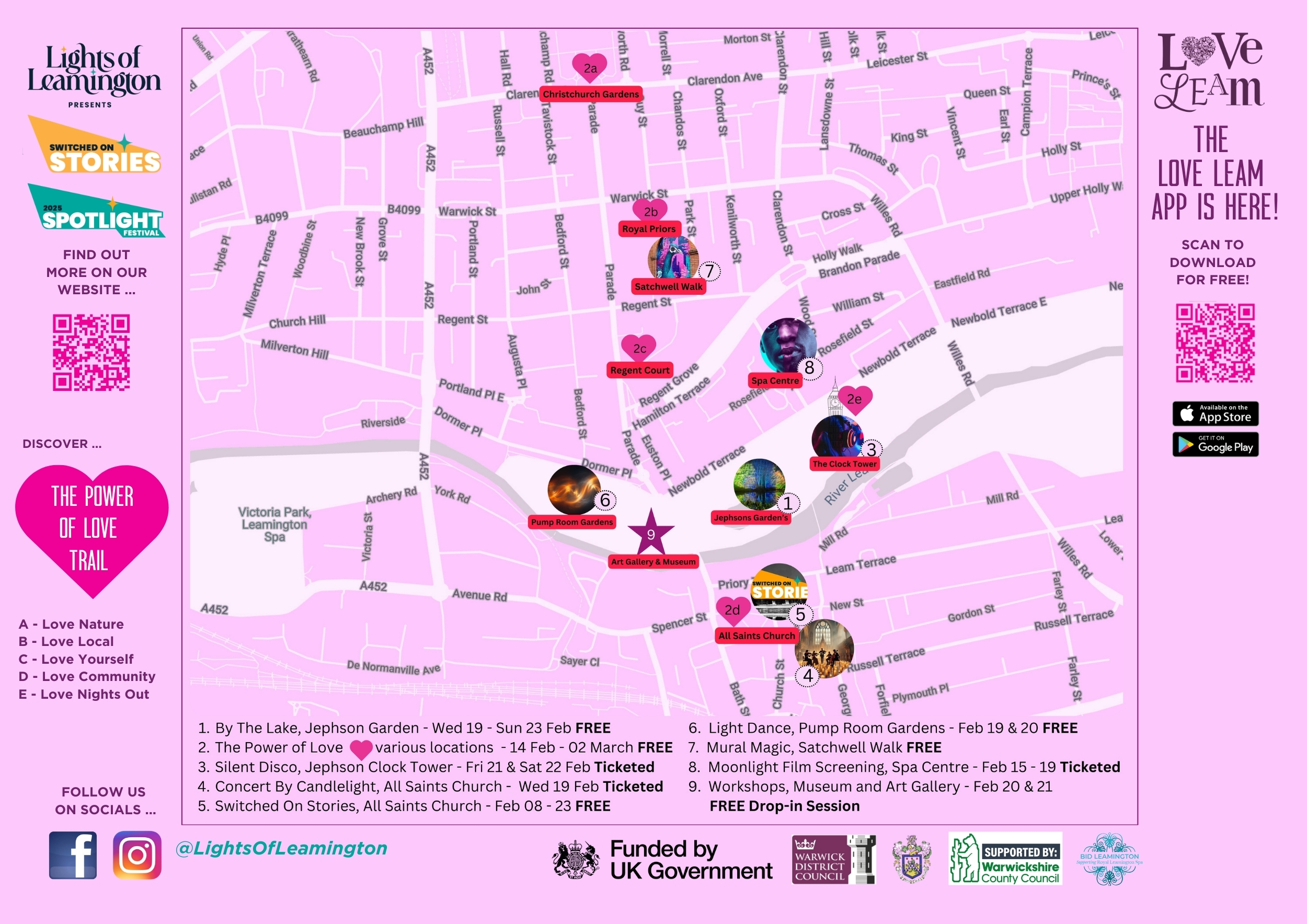 Visitors can follow the trail using the Love Leam App, or maps which are available from this website (please click here – PDF) (please click here – JPG) and visitor locations in town. Adding to the fun, visitors can also take part in a competition to win £100 to spend in the town centre! To enter, simply share a photo of your favourite hearts on social media using #LoveLeamHeartTrail and tag @LightsofLeamington.