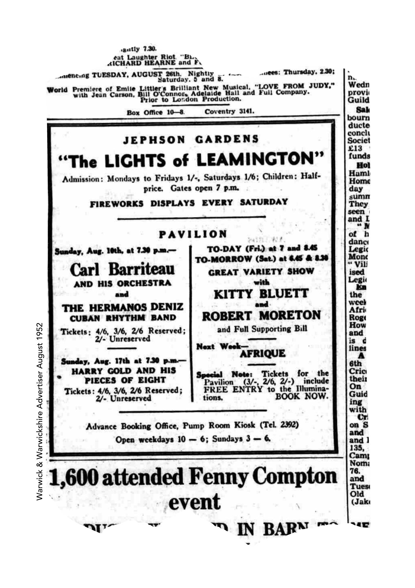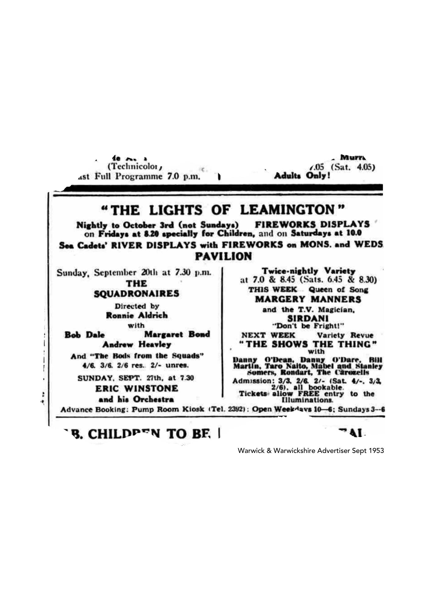 She’s come across these wonderful advertisements for Festival in the 1950’s. They invite the public not only to see the lights in the Jephson Gardens but also to nightly concerts in the Pavilion.